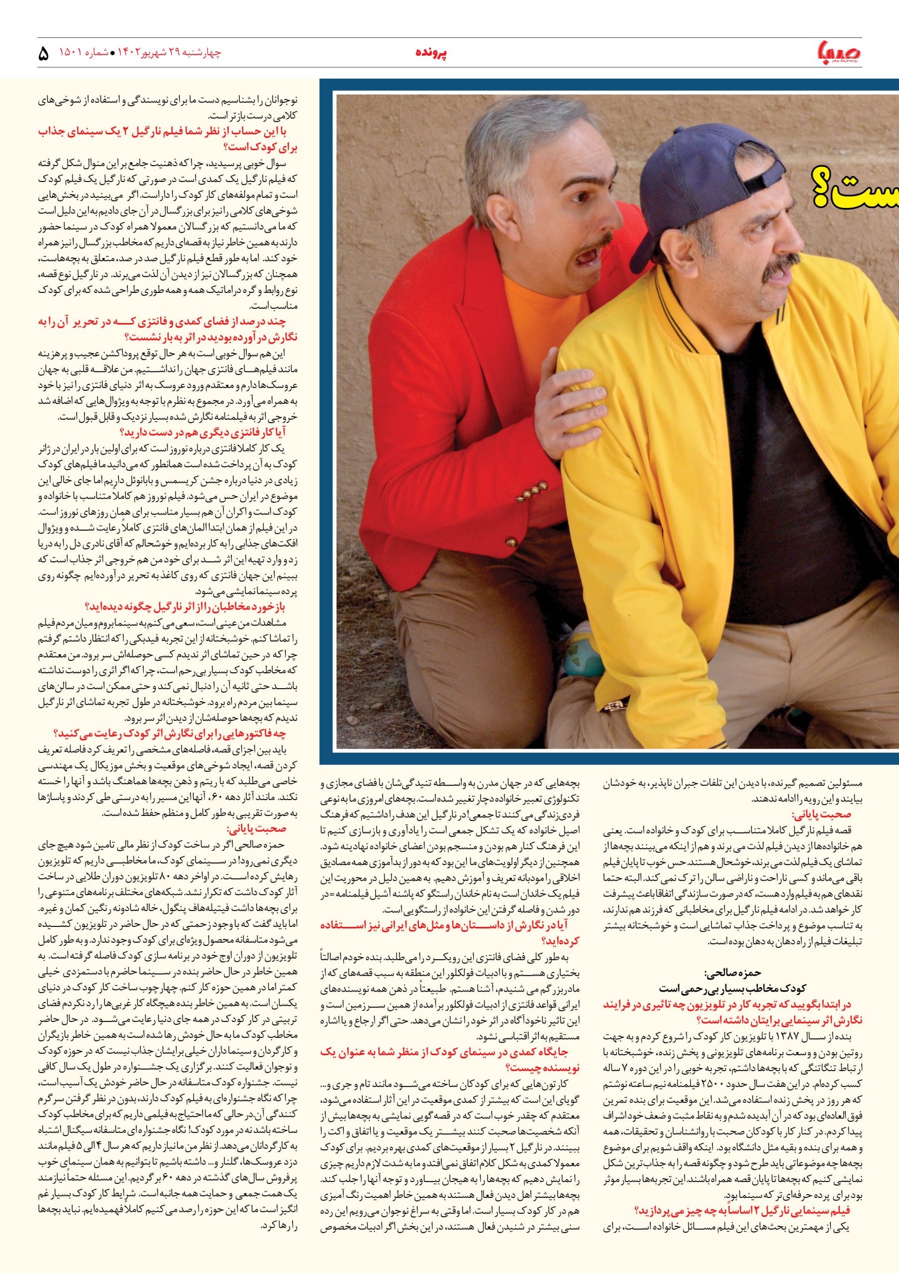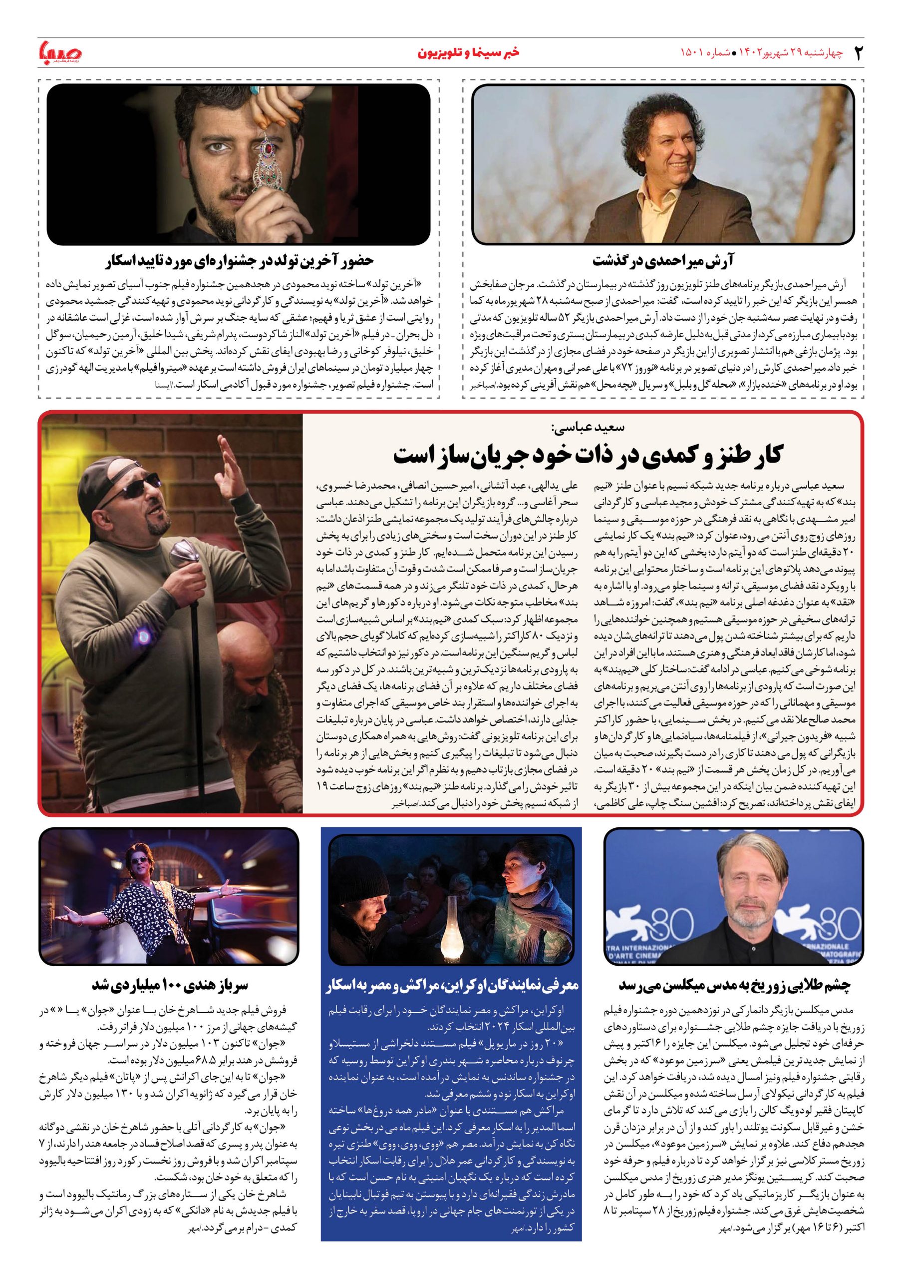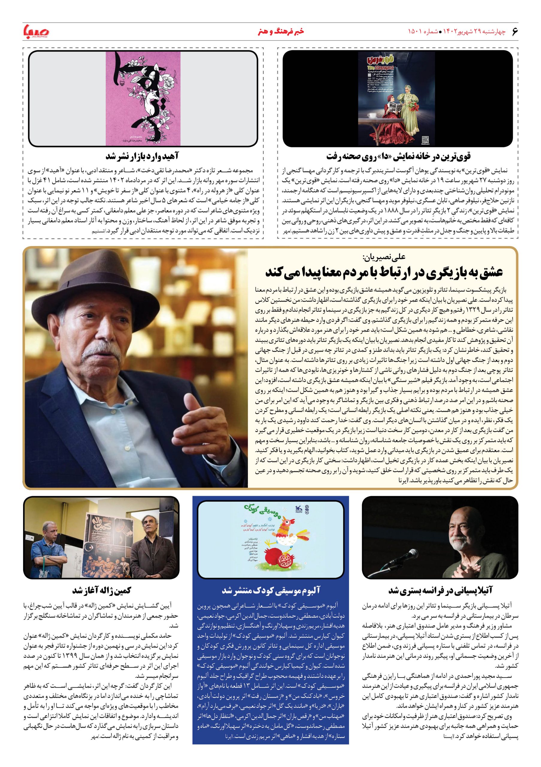 شماره۱۵۰۱| روزنامه صبا چهارشنبه ۲۹ شهریور