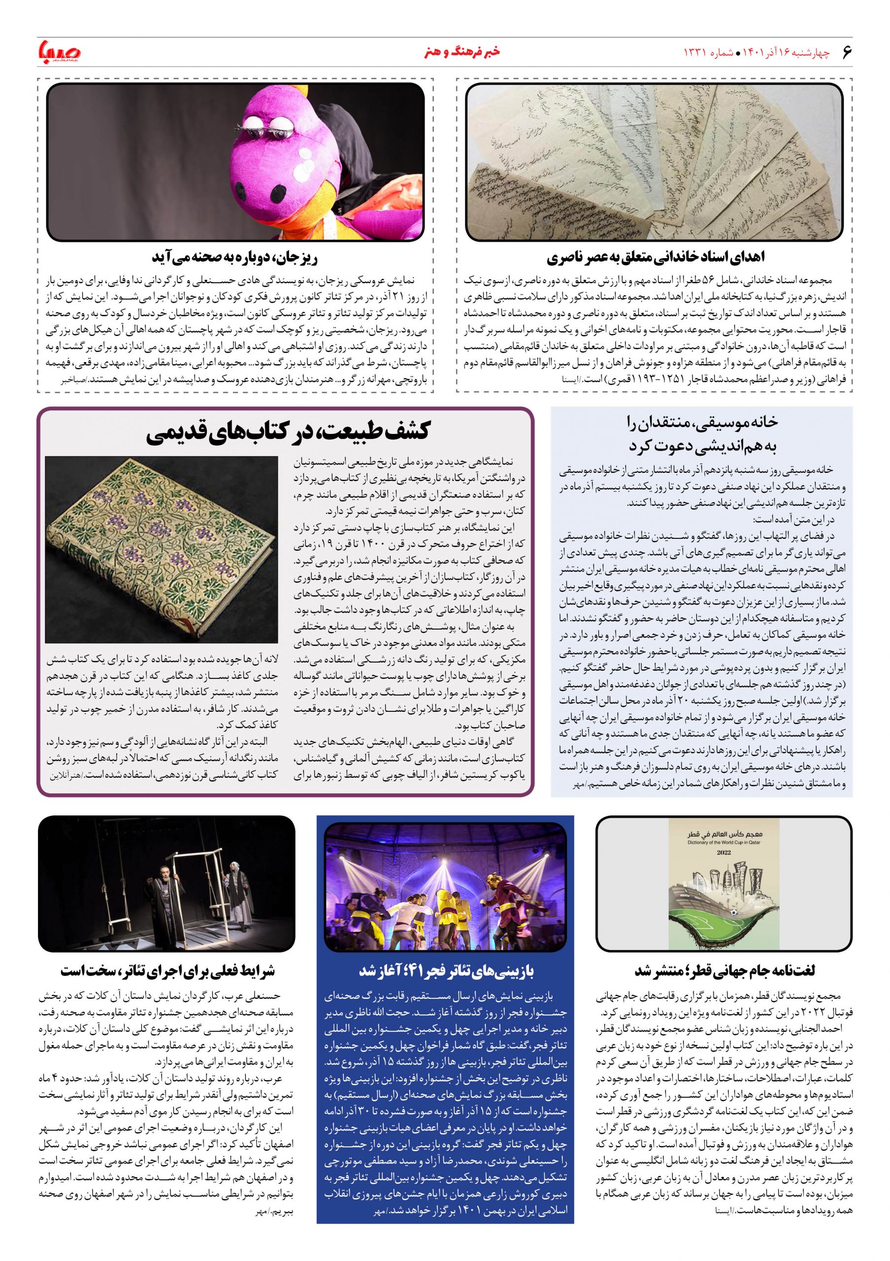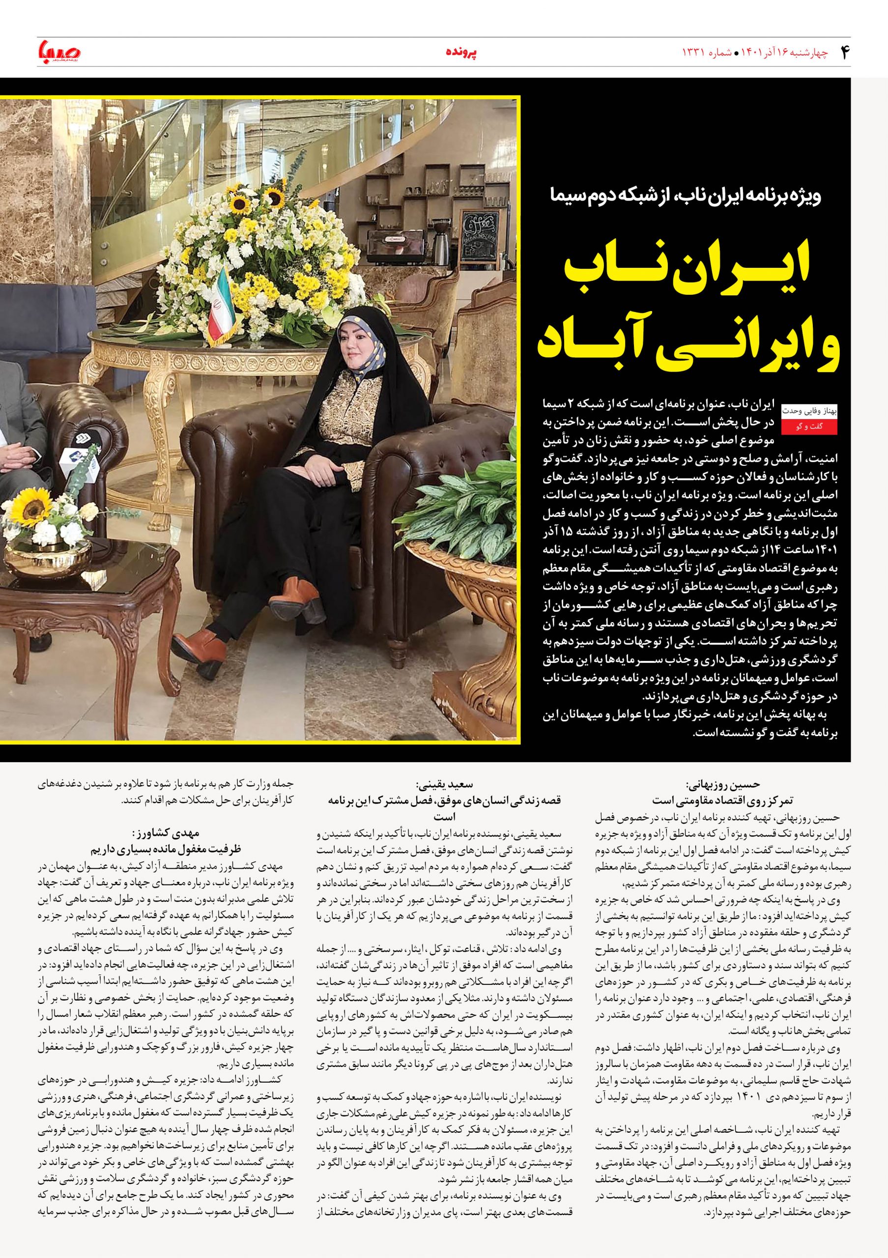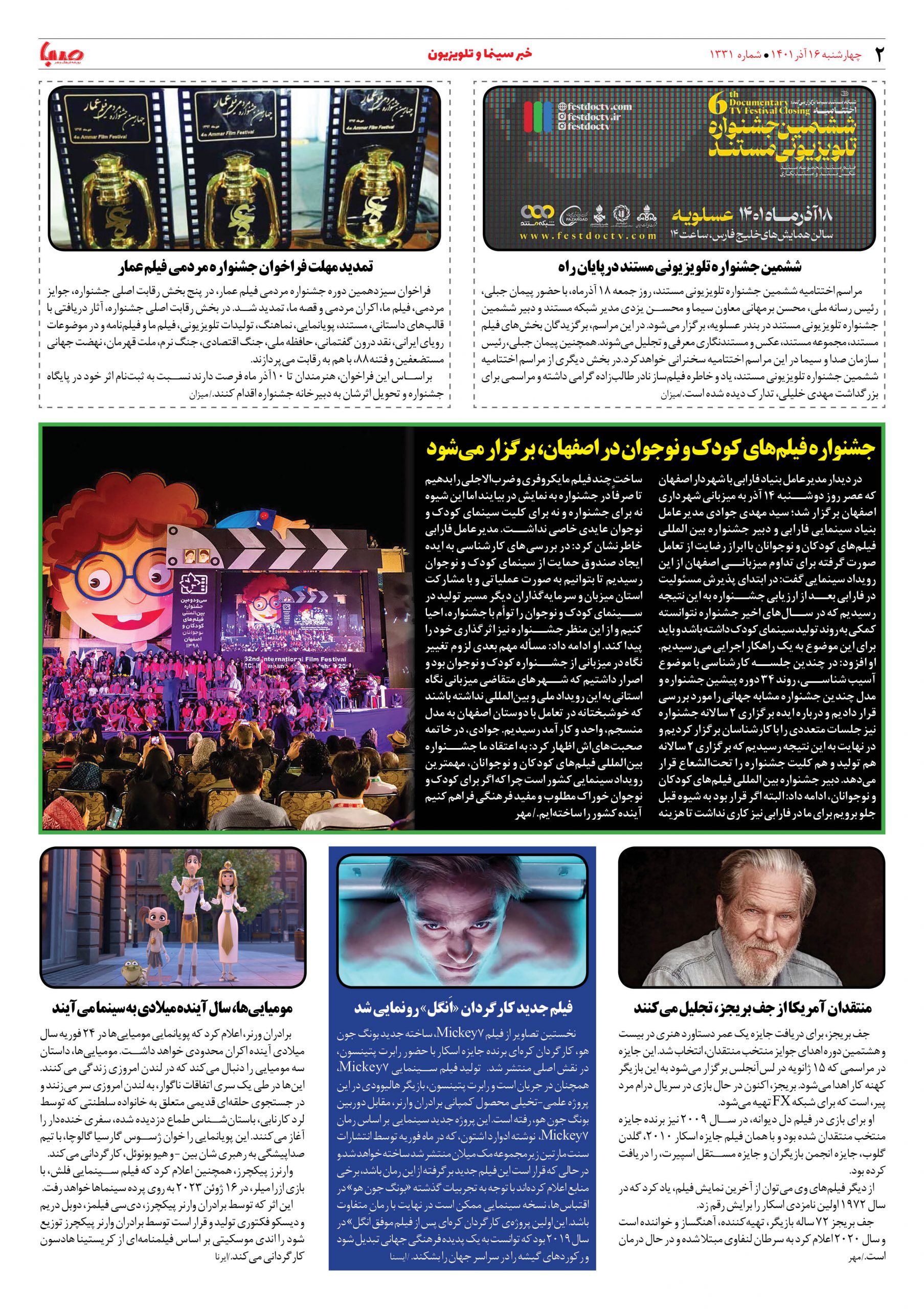 شماره ۱۳۳۱| روزنامه صبا چهارشنبه ۱۶ آذر ۱۴۰۱