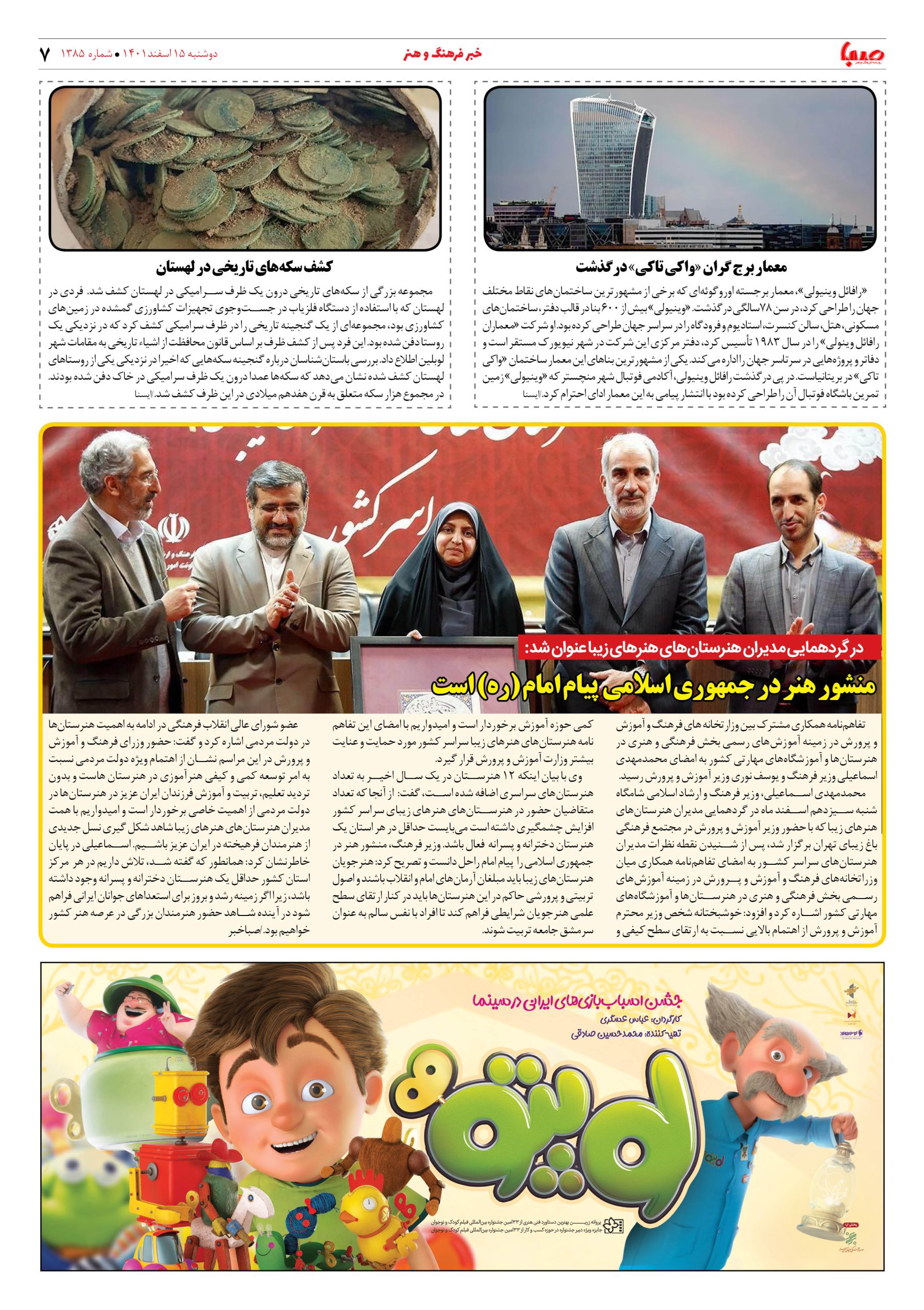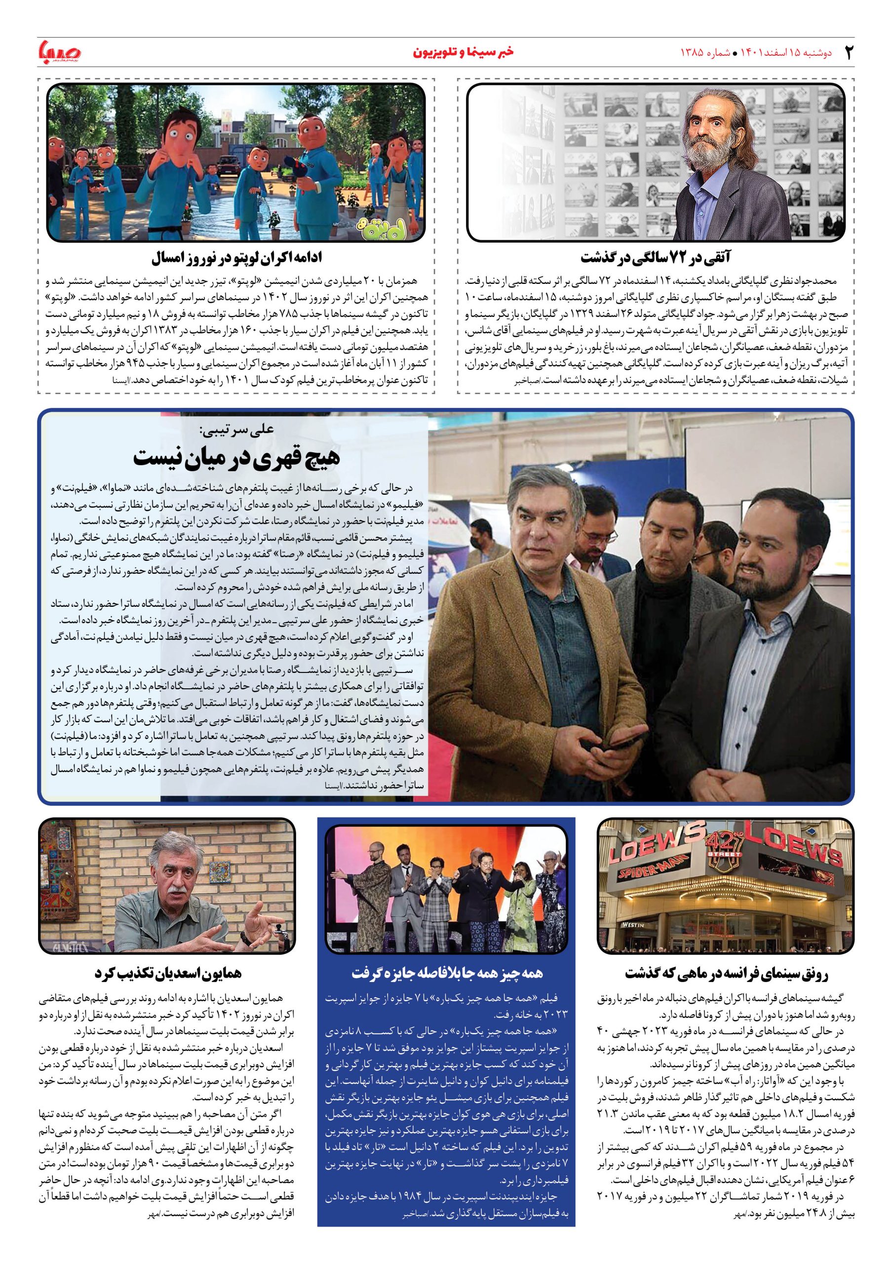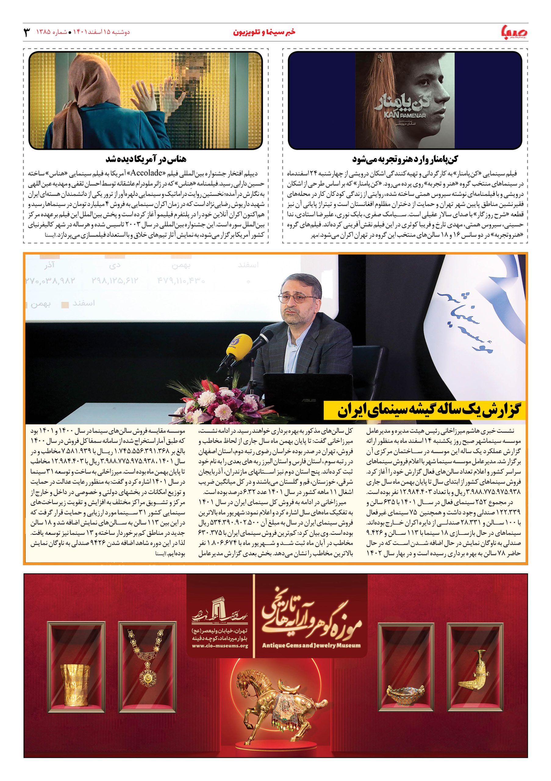 شماره ۱۳۸۵| روزنامه صبا دوشنبه ۱۵اسفند ۱۴۰۱