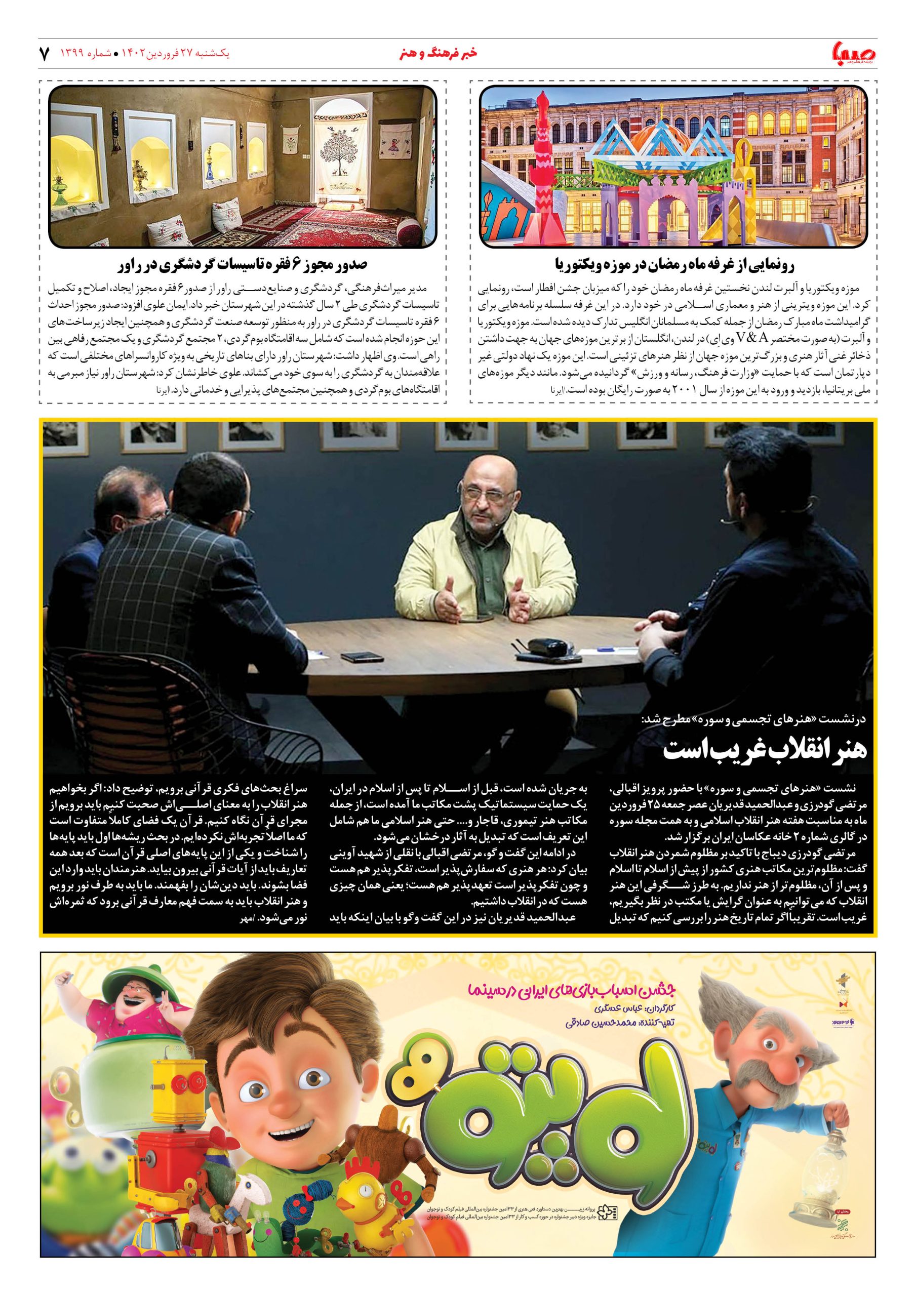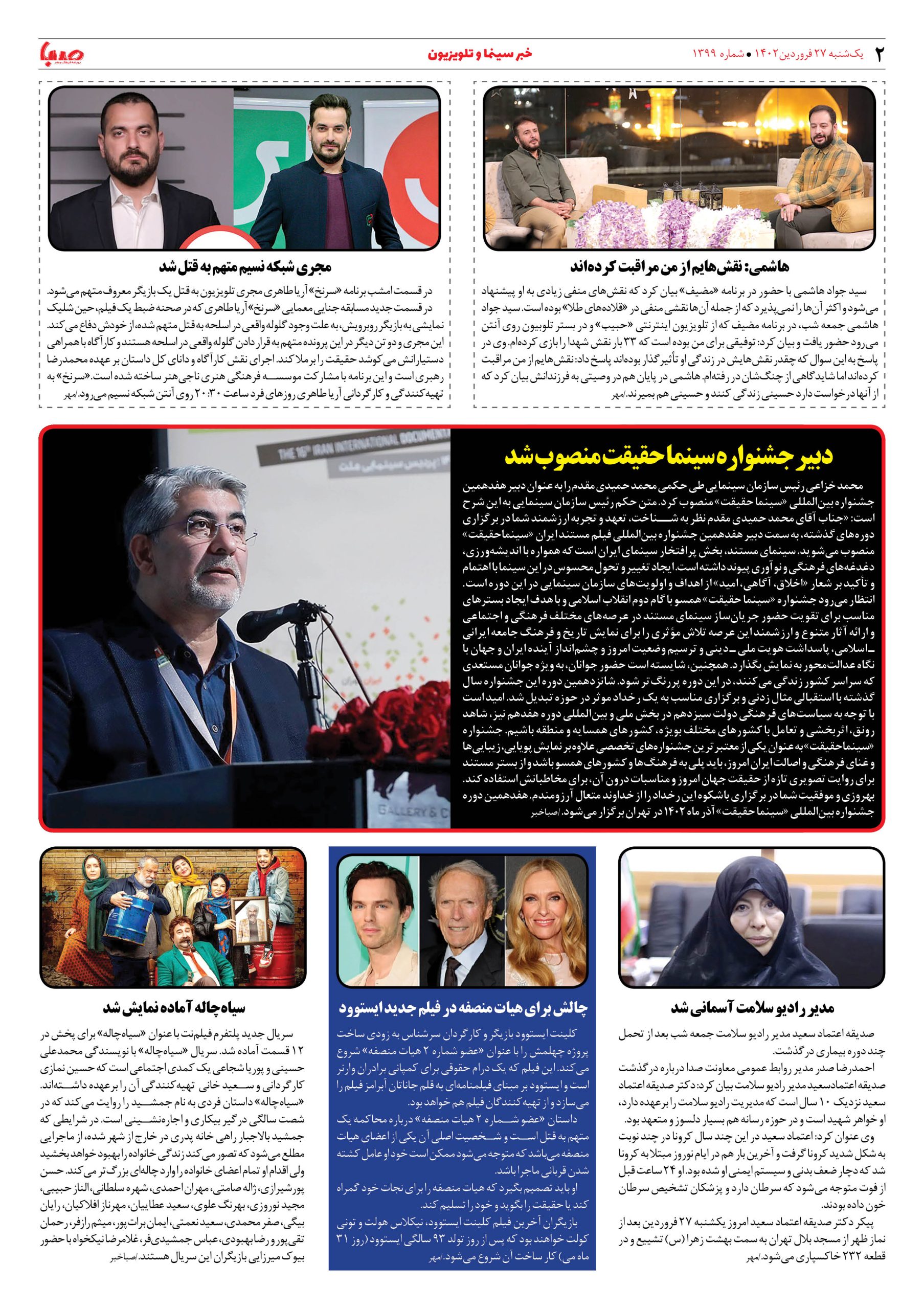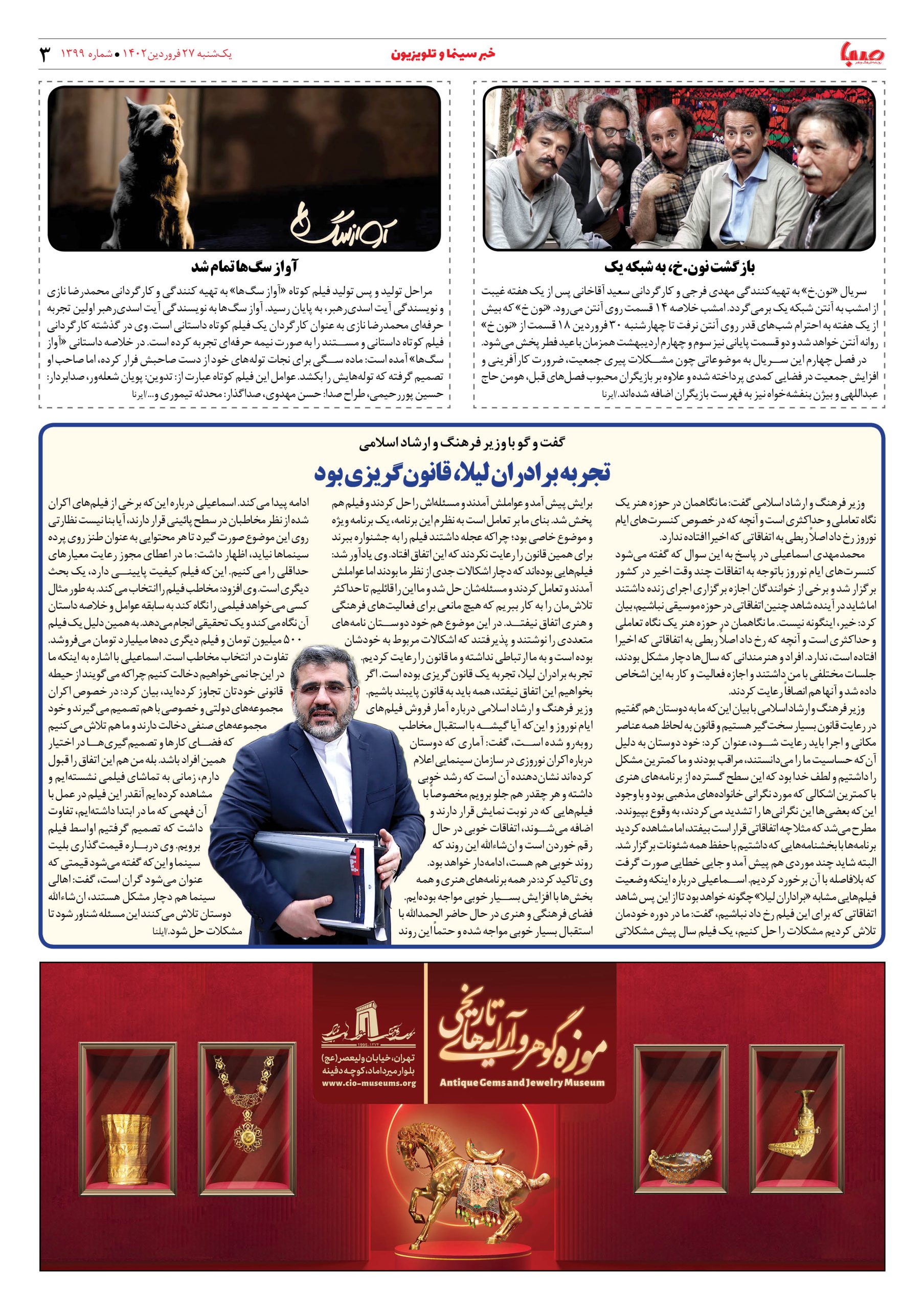 شماره ۱۳۹۹| روزنامه صبا یکشنبه ۲۷ فروردین ۱۴۰۲