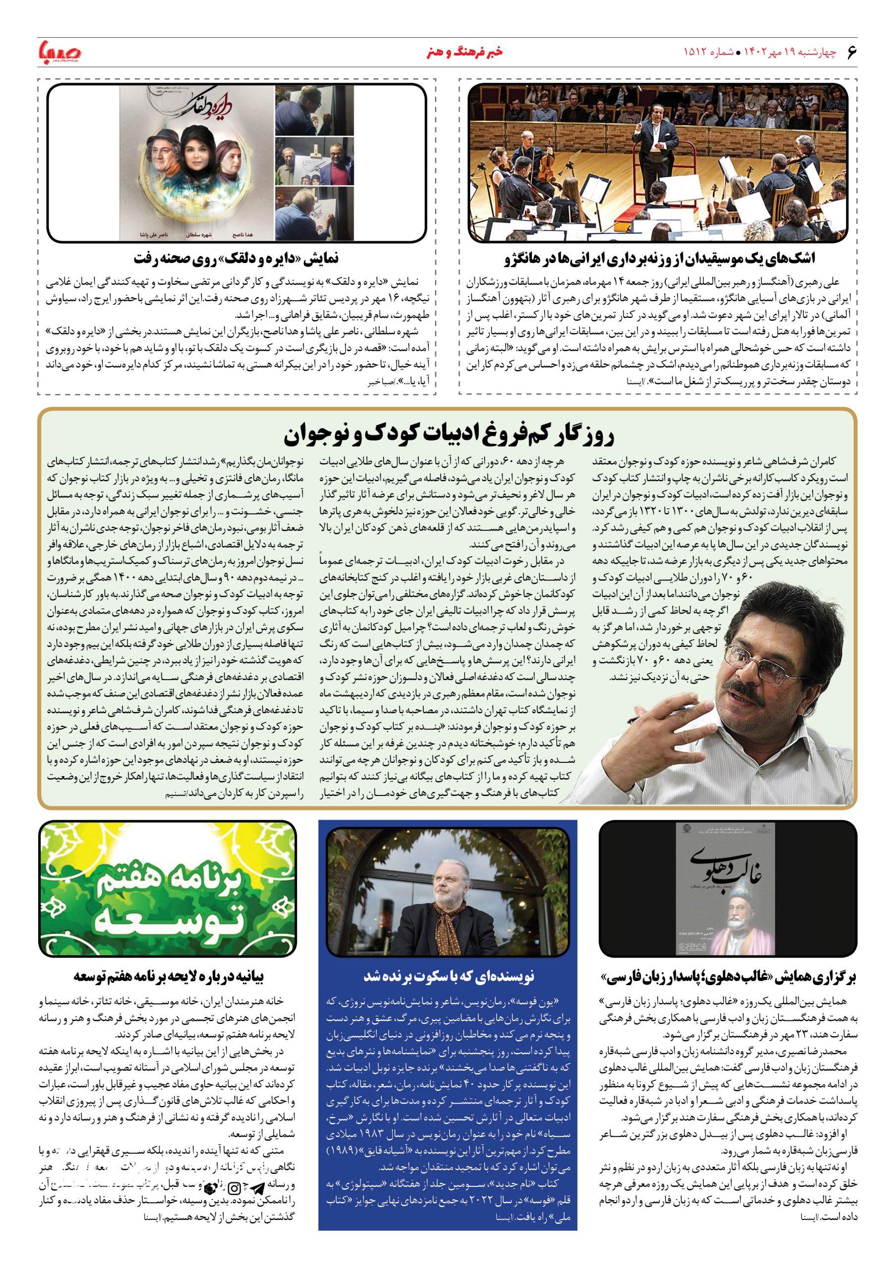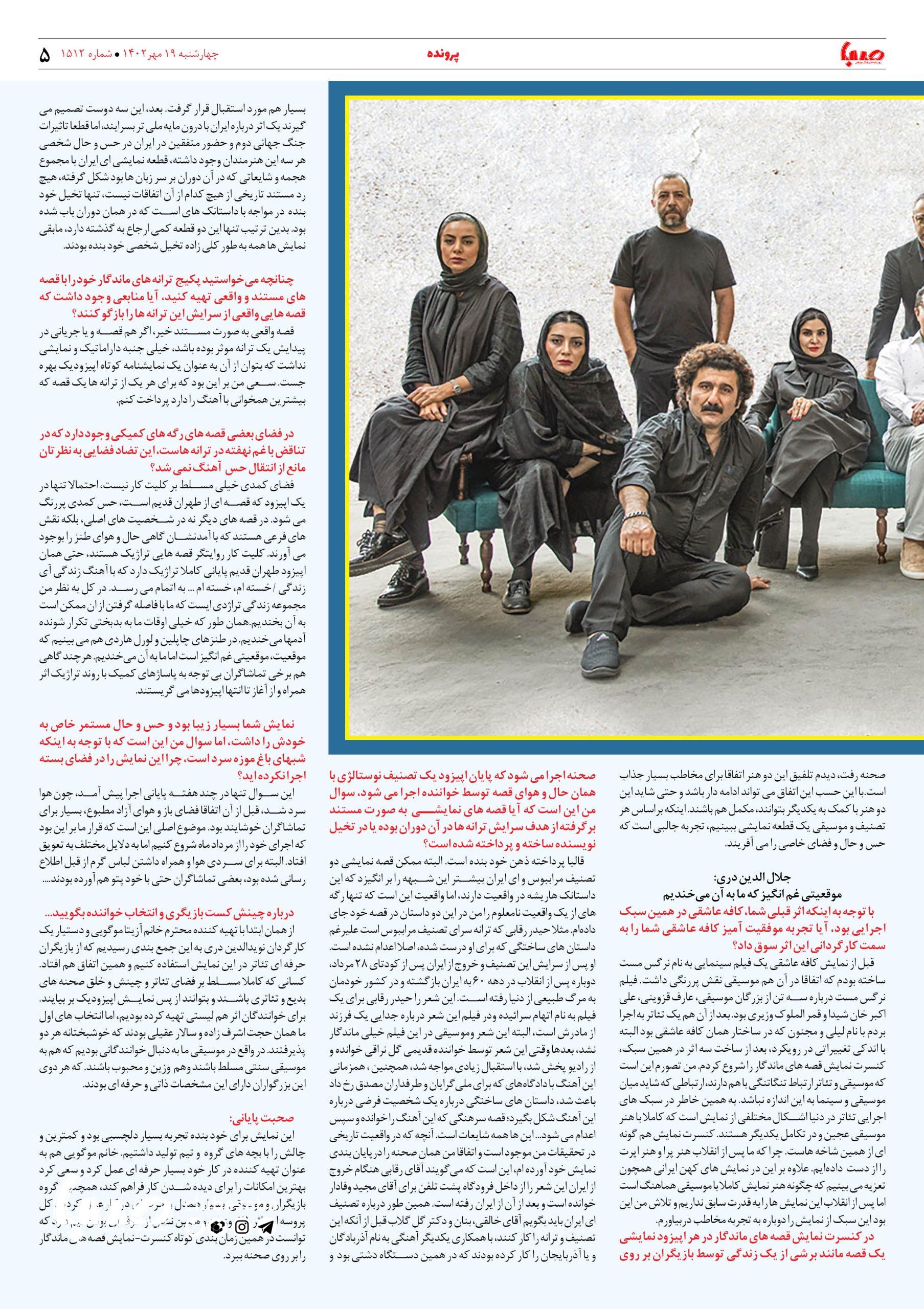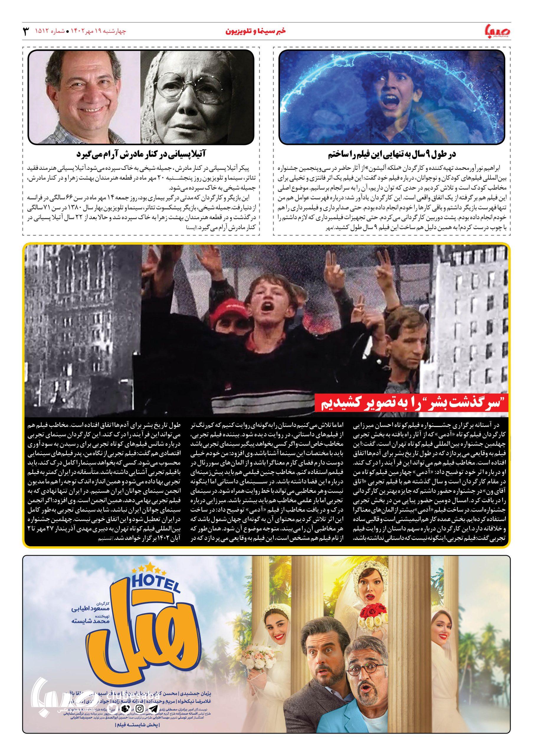 شماره ۱۵۱۲| روزنامه صبا چهارشنبه ۱۹مهر