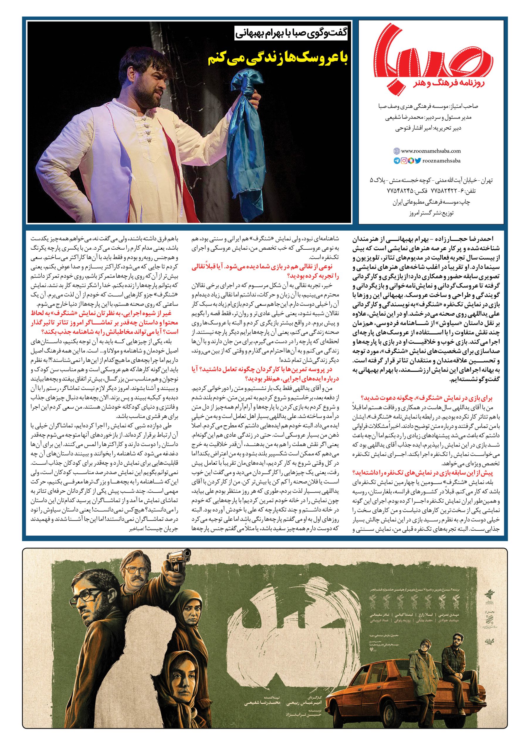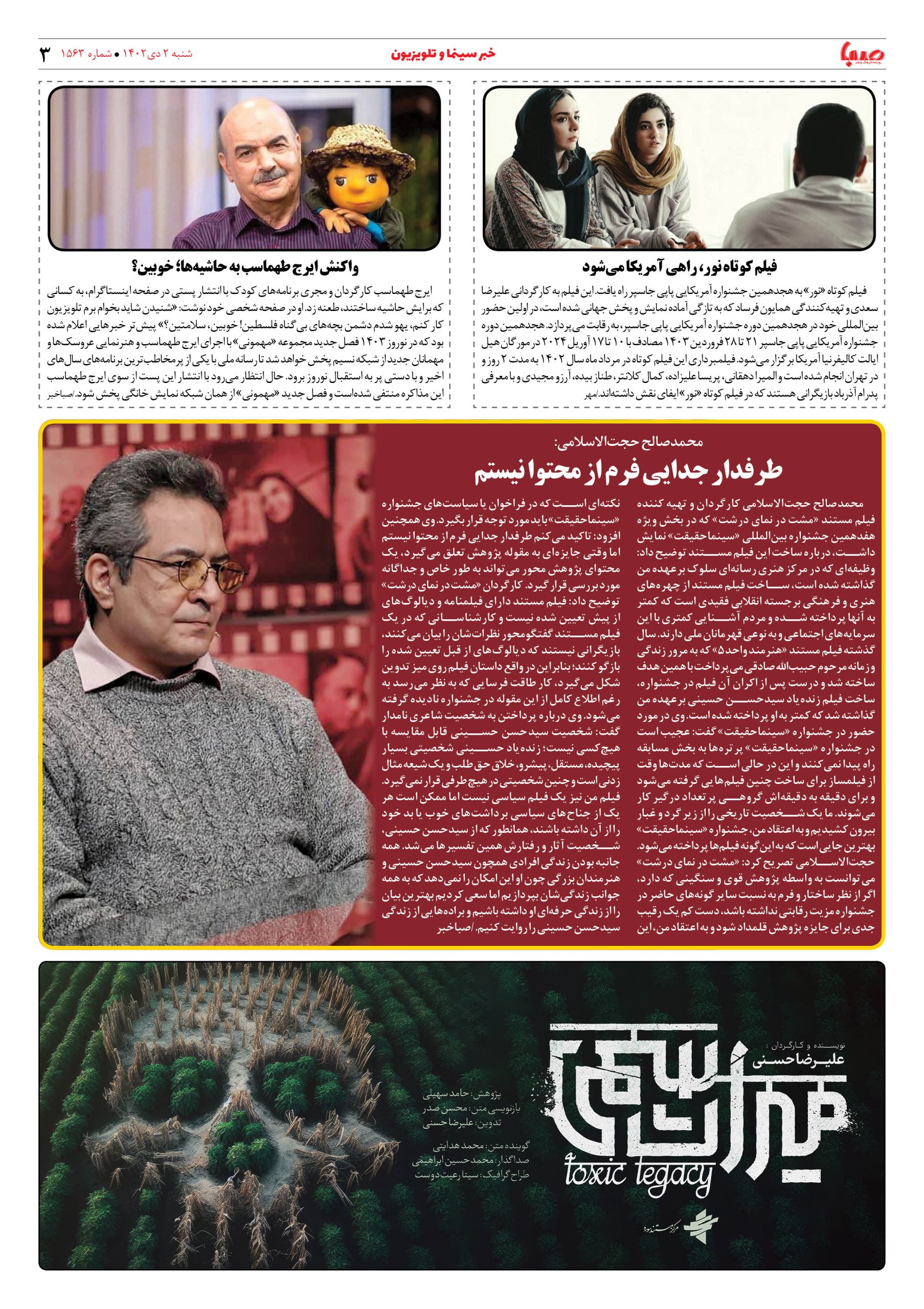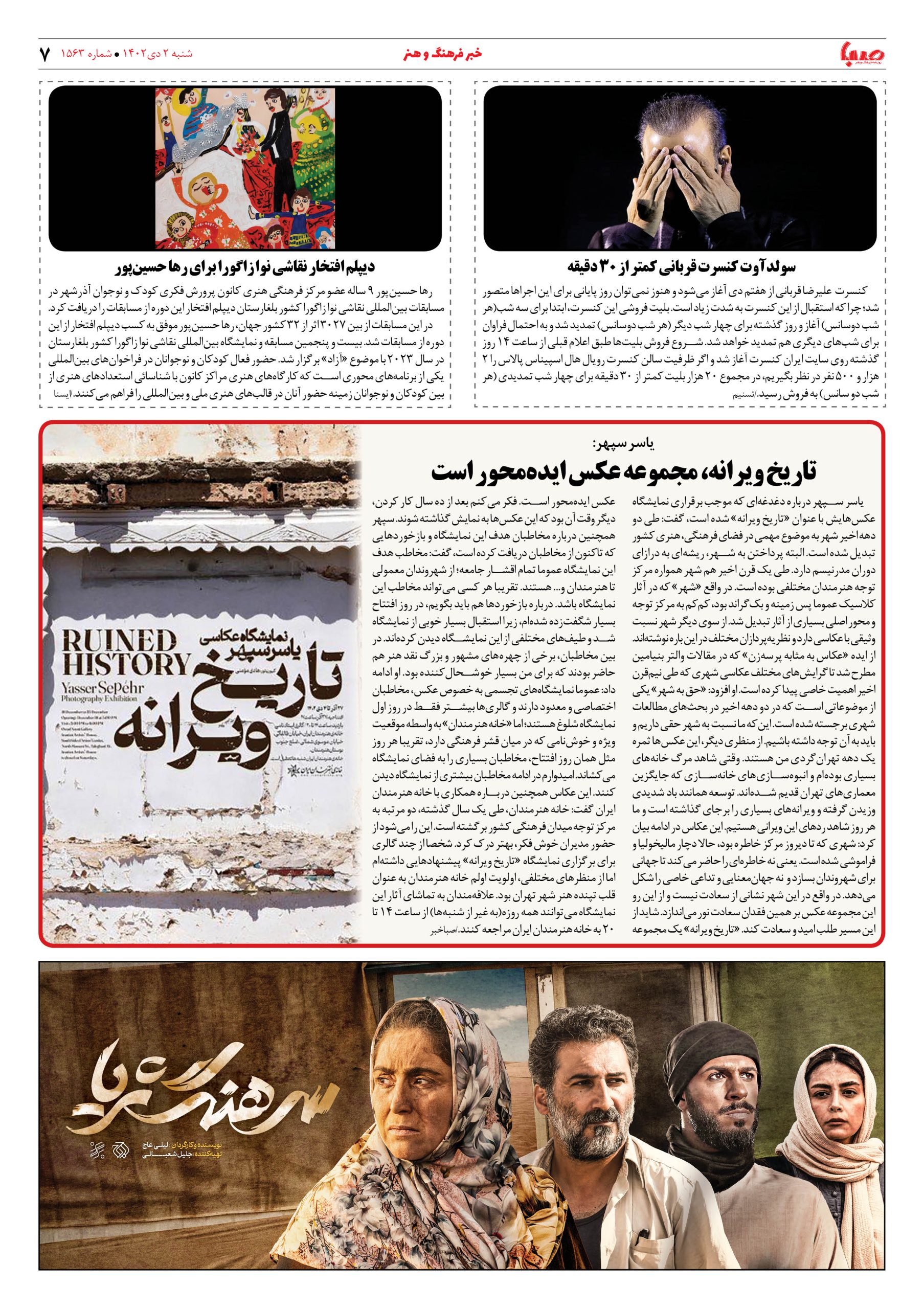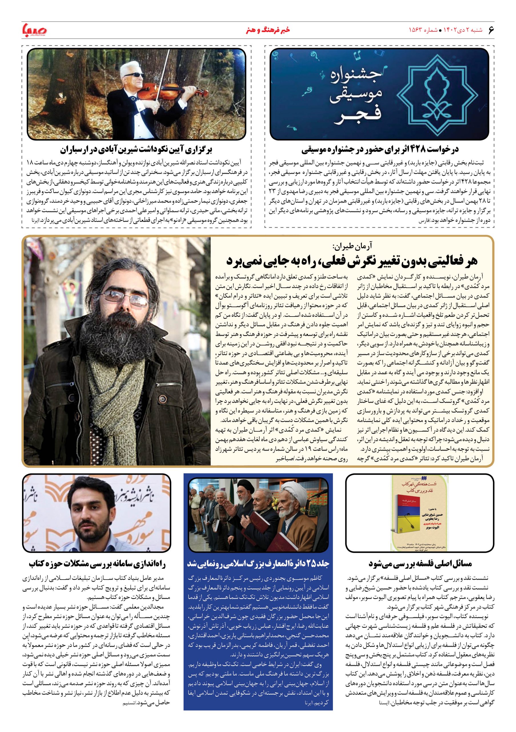 شماره۱۵۶۳| روزنامه صبا شنبه ۲ دی