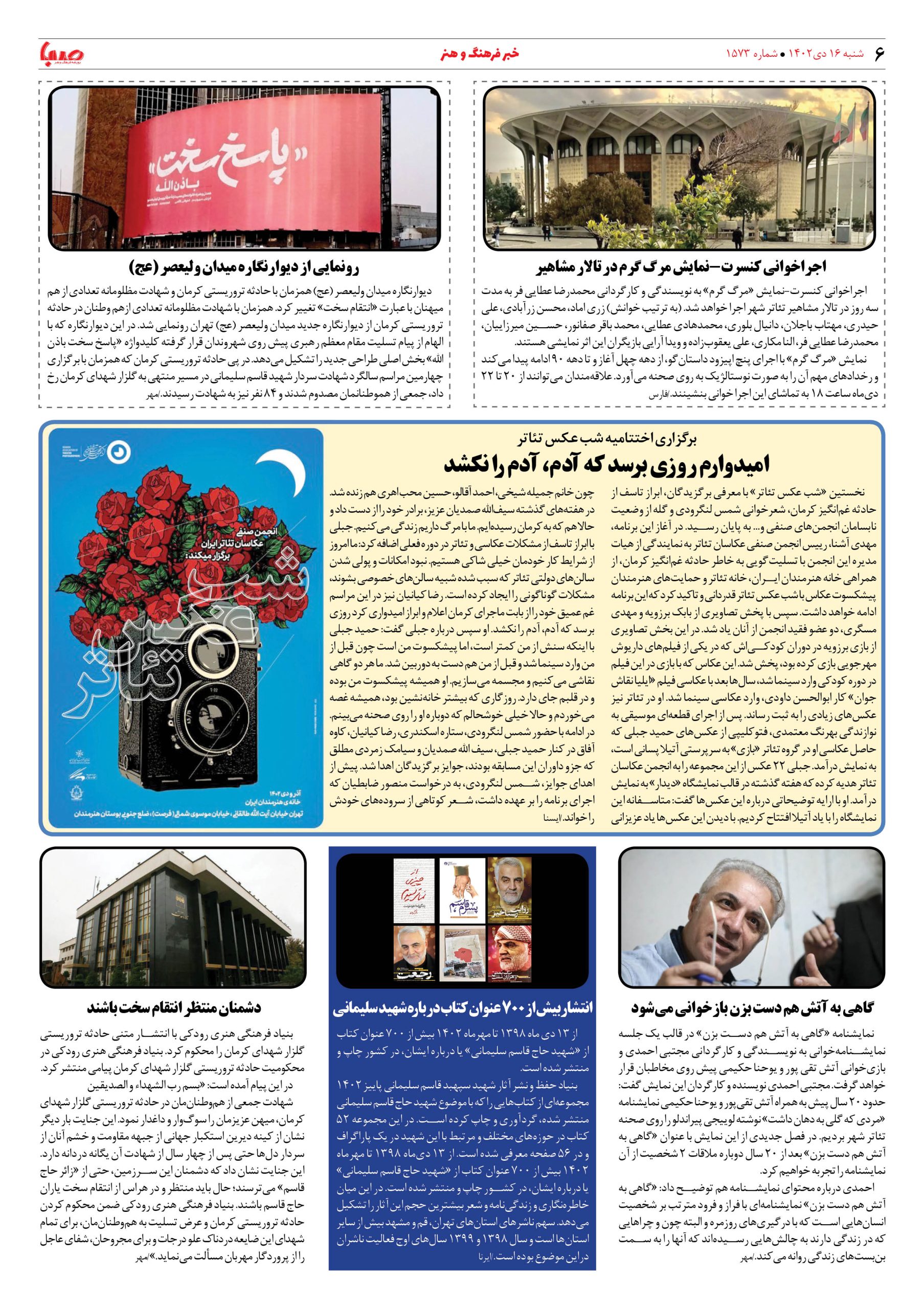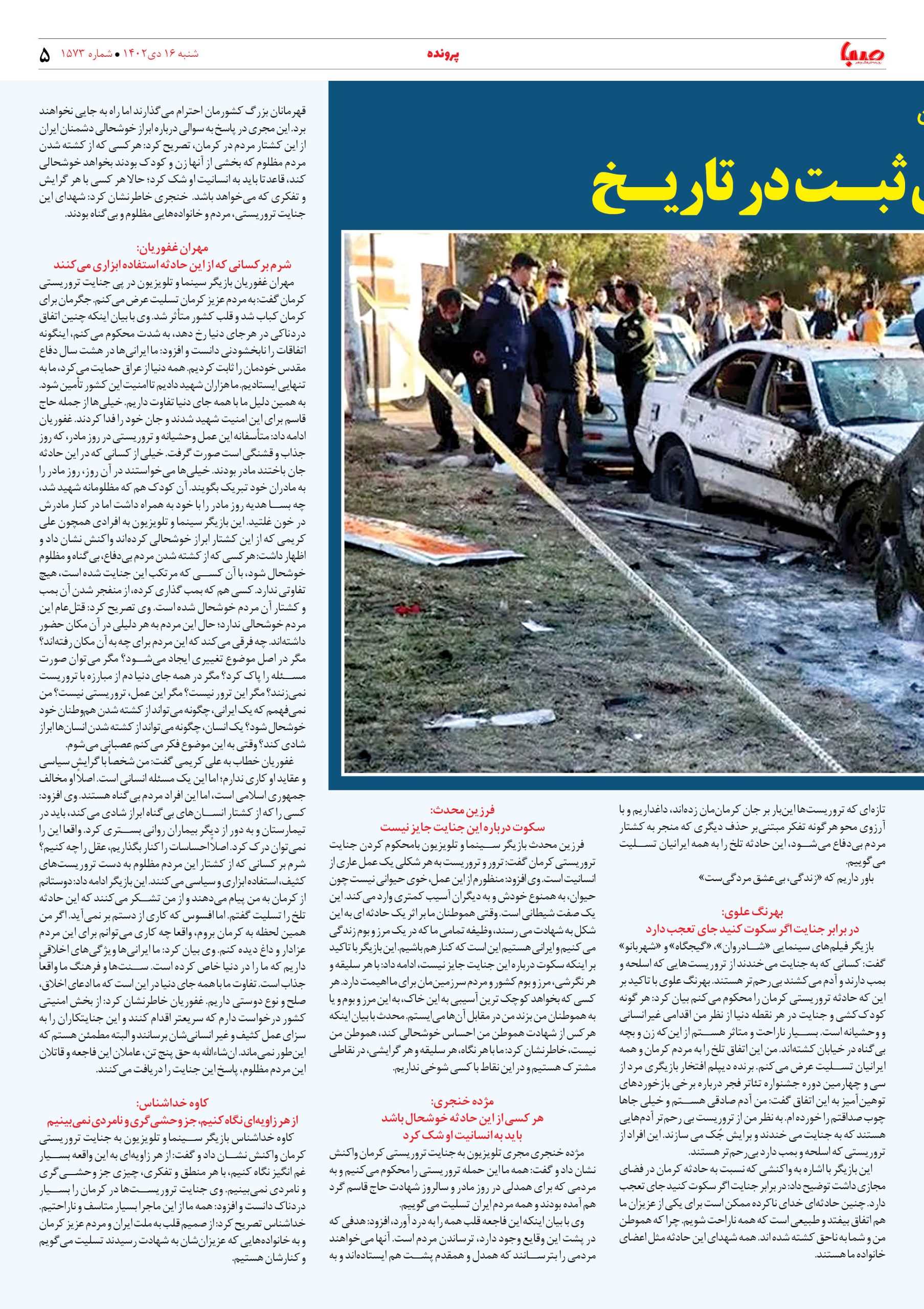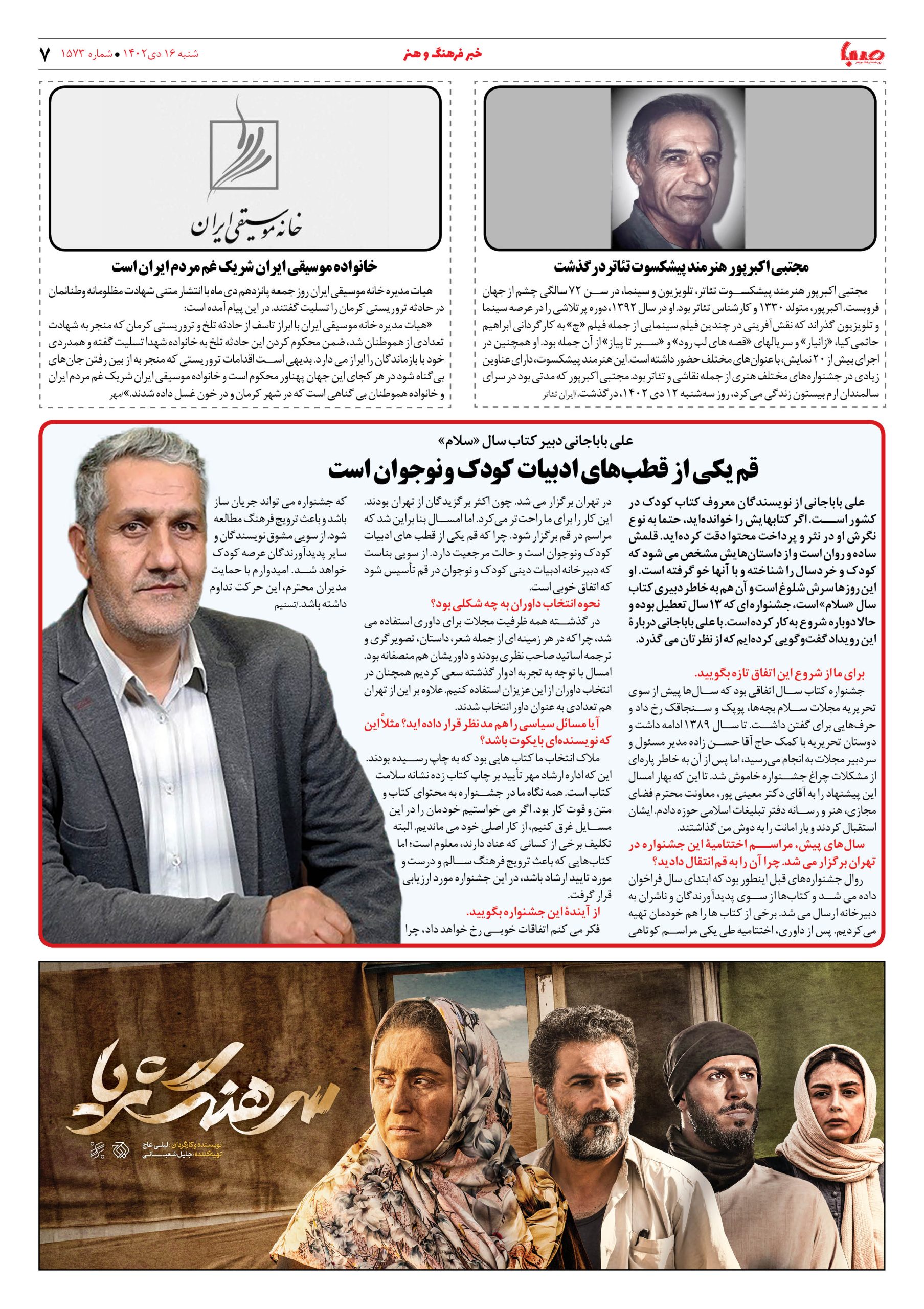 شماره۱۵۷۳| روزنامه صبا شنبه ۱۶دی