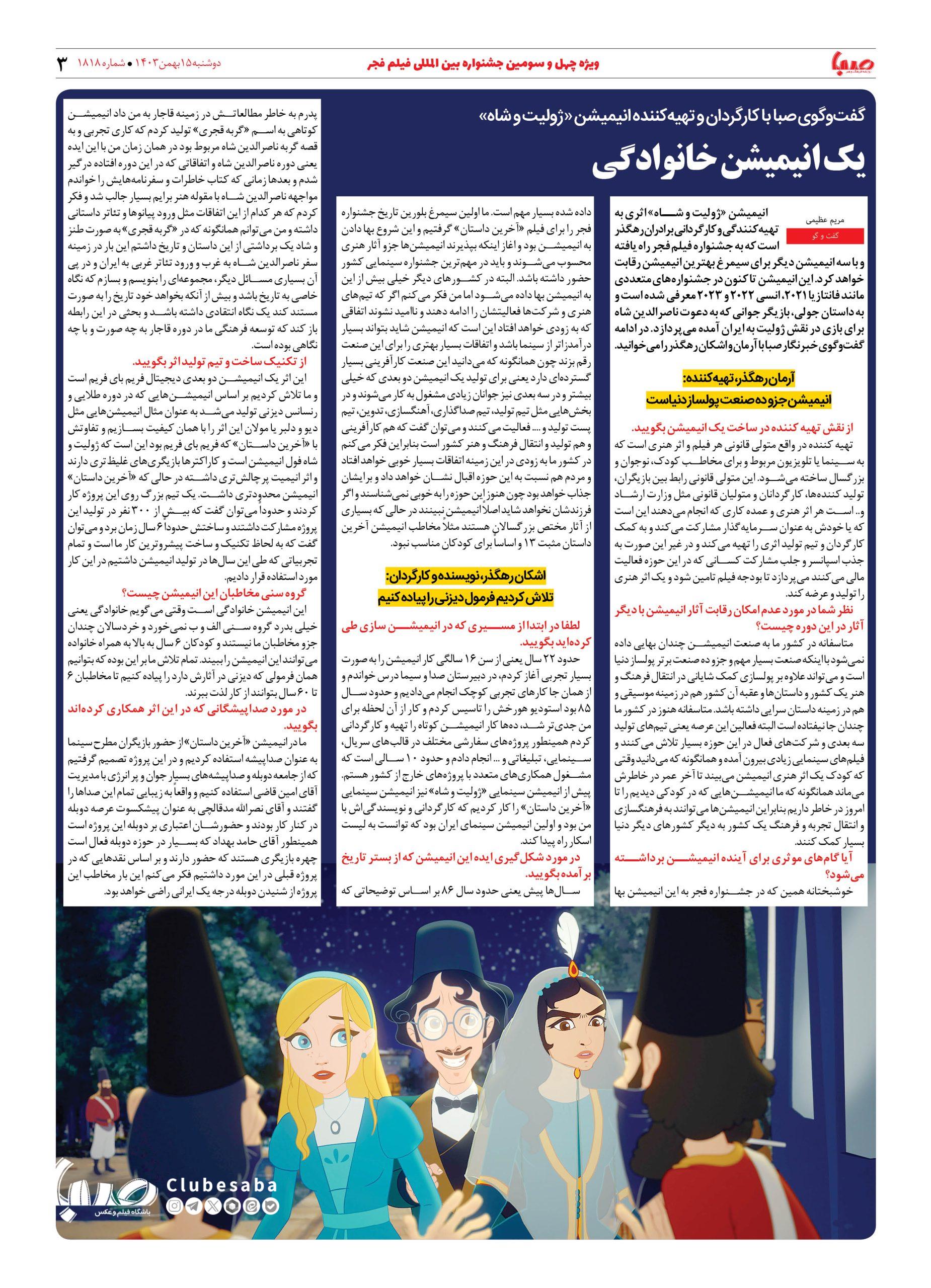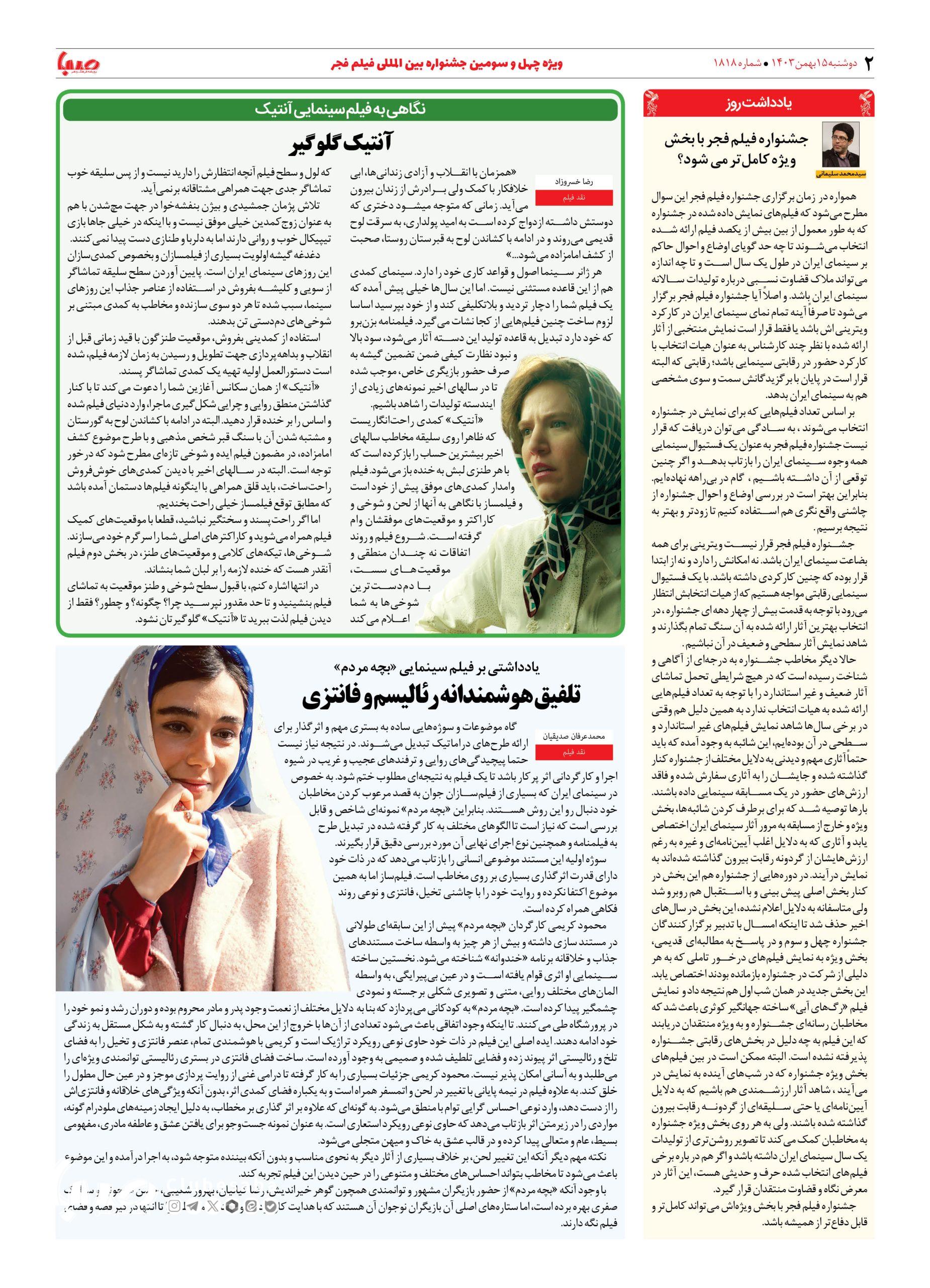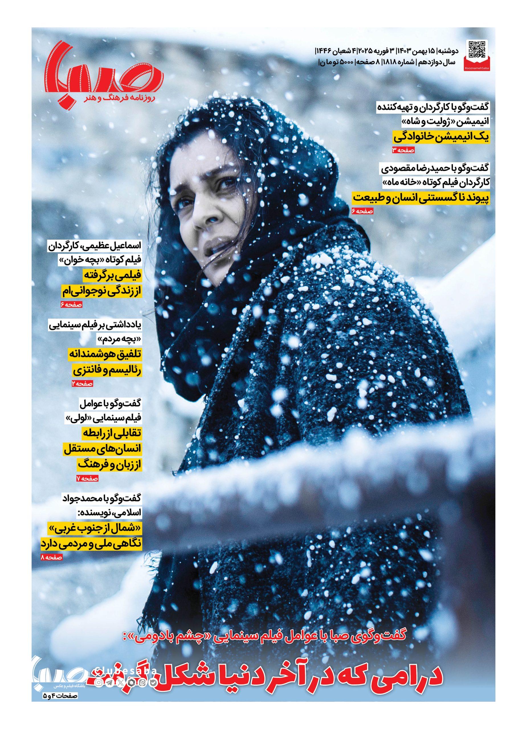 شماره ۱۸۱۸| روزنامه صبا دوشنبه ۱۵ بهمن ۱۴۰۳